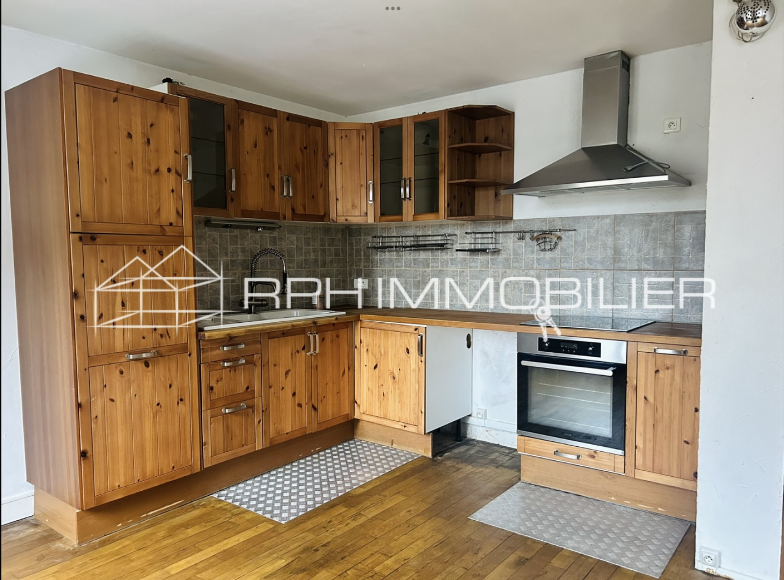 La cuisine est équipée de rangements, d'un four et d'une hotte.