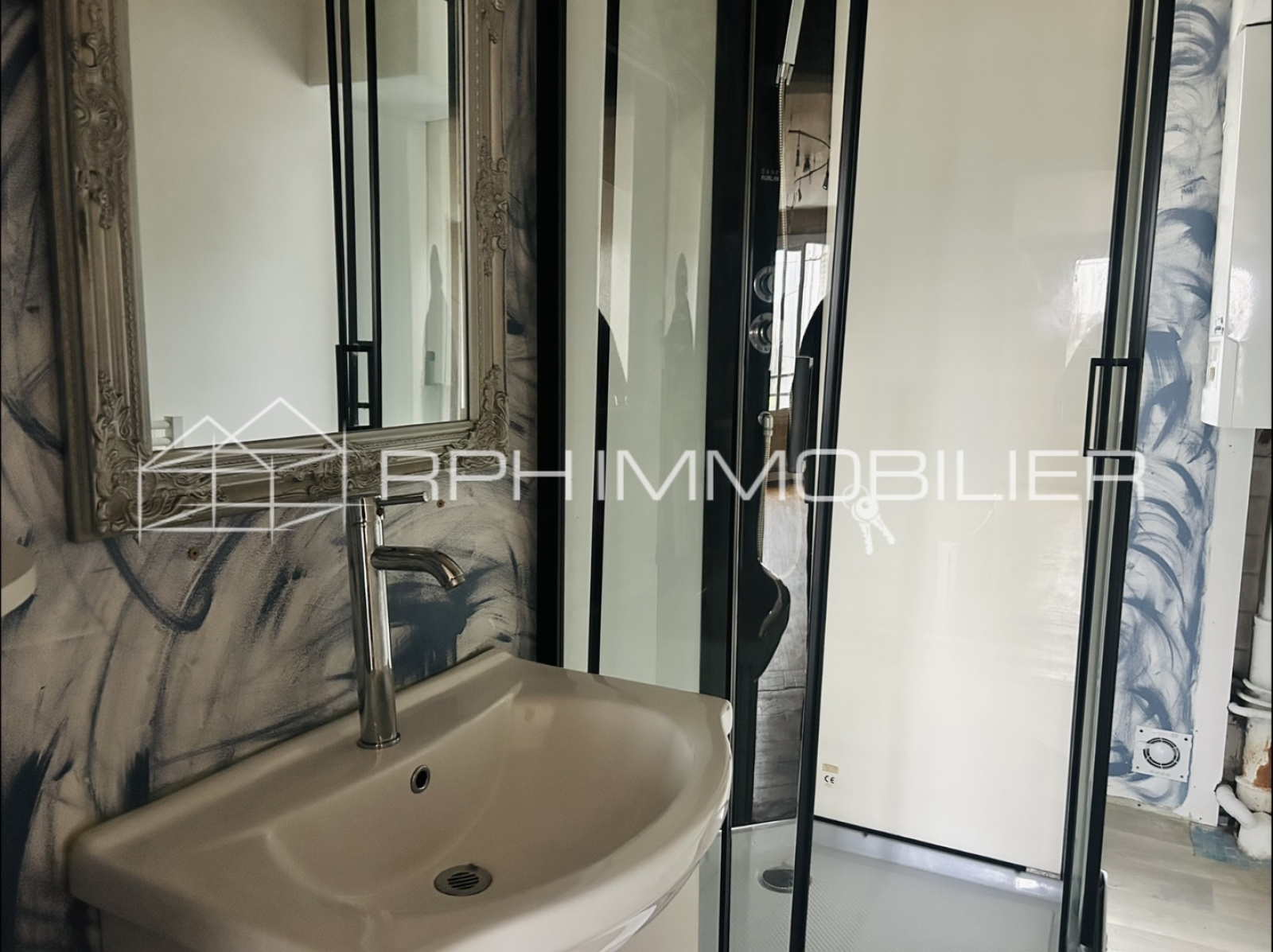 La salle d'eau dispose d'une cabine de douche, d'un meuble vasque et d'un sèche-serviettes.